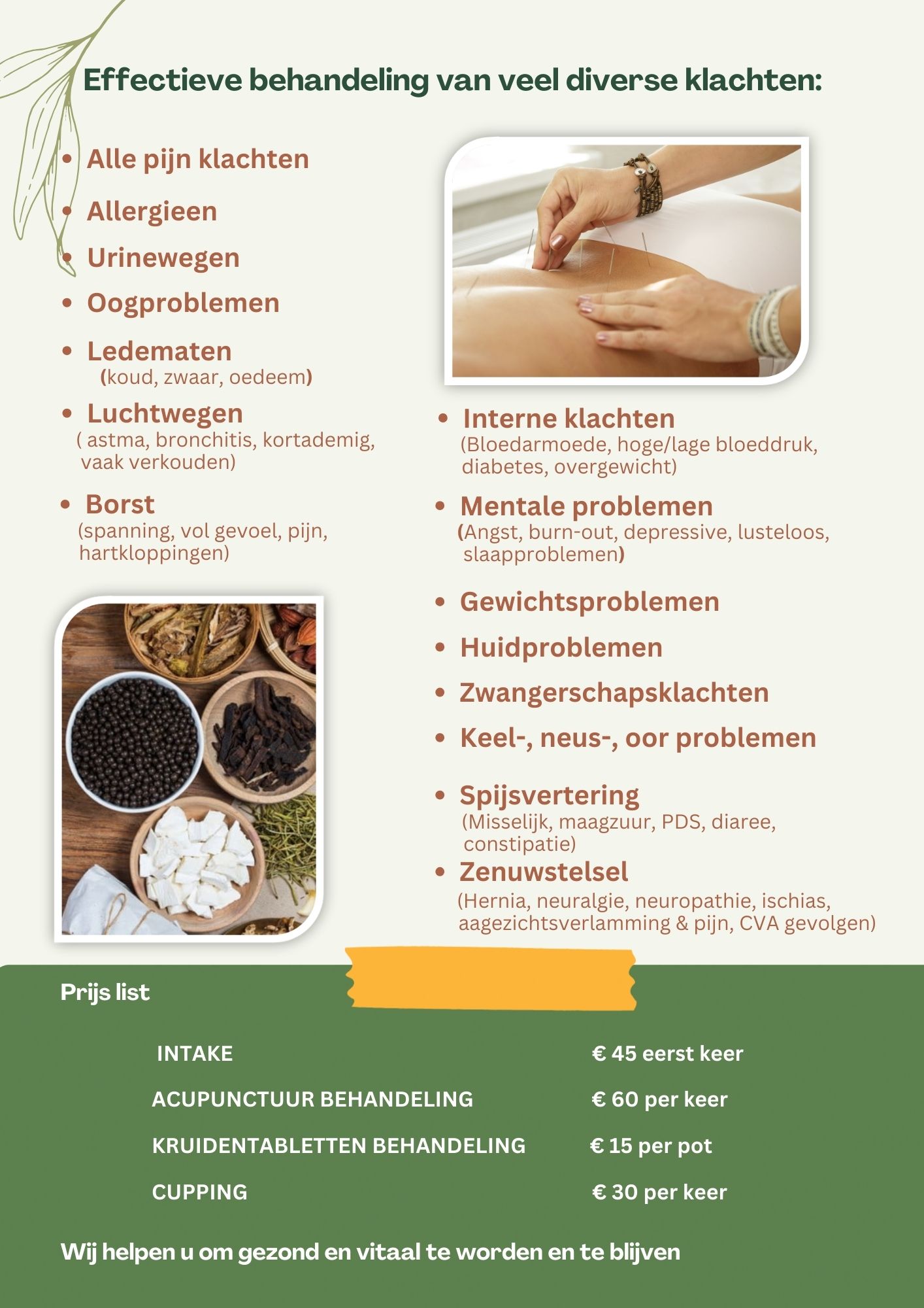 We proberen met Acupunctuur en kruiden het lichaam warmer te maken om zo het immuunsysteem een boost te geven. Hierdoor zou de natuurlijke balans en gezondheid van het lichaam weer terug kunnen keren.